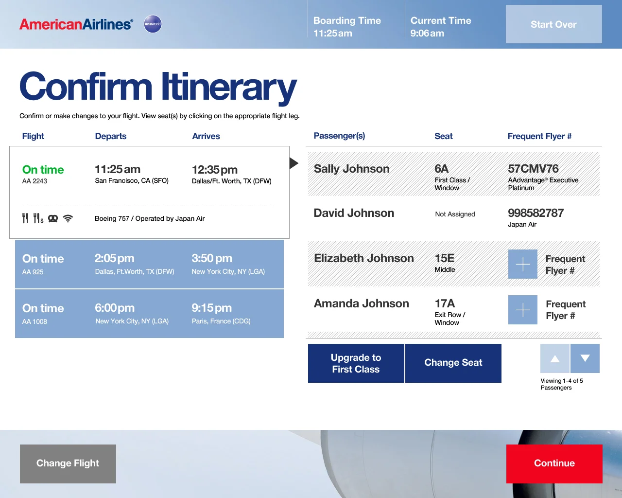 Bold, simple choices allow the passenger to get started. We referenced boarding passes to provide a familiar hierarchy for the most important passenger information. Color-coded choices that distinguish optional from required steps were also introduced. Last but not least, we set it all on a black & white palette of beautiful shots of aircrafts.