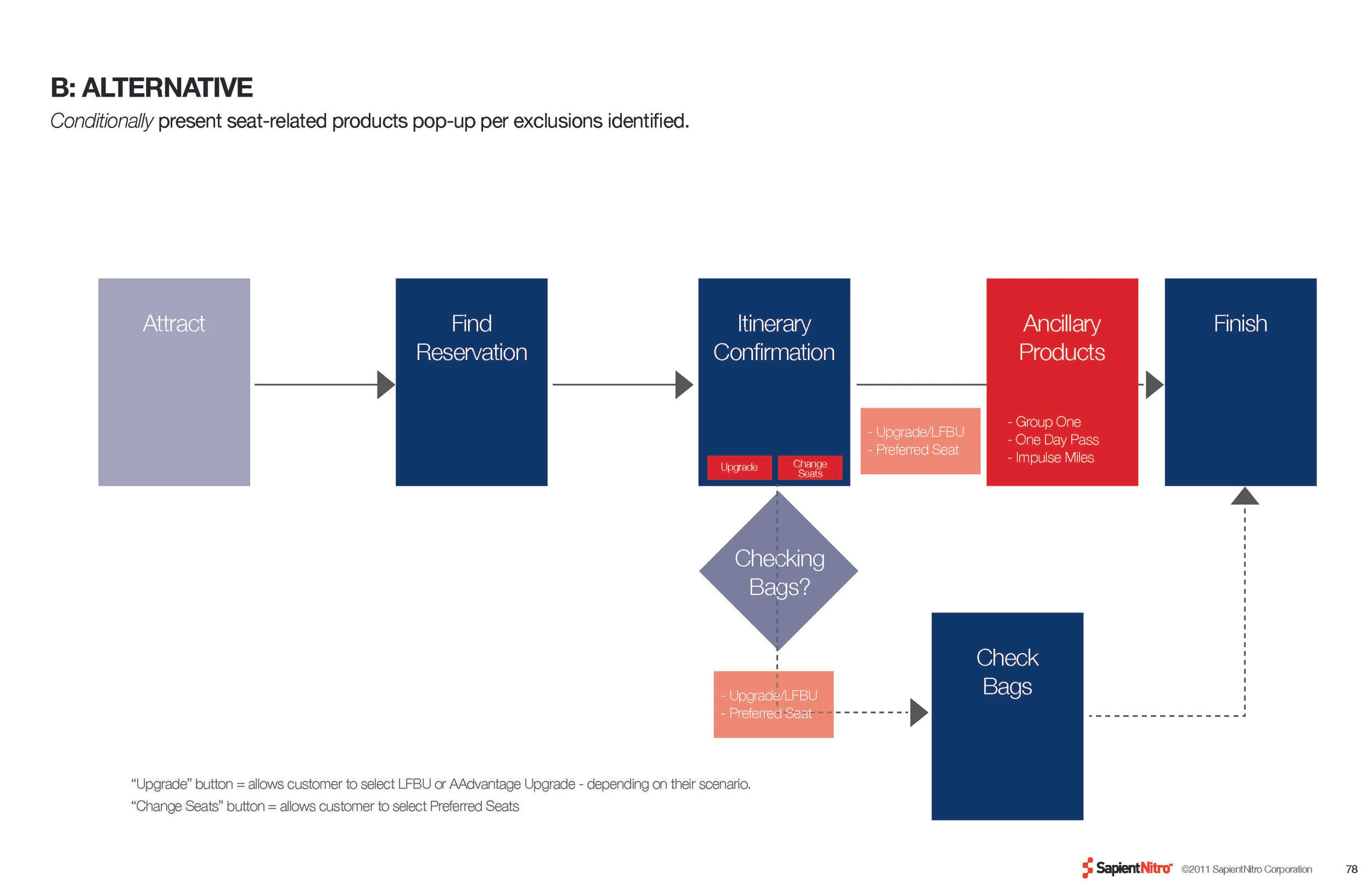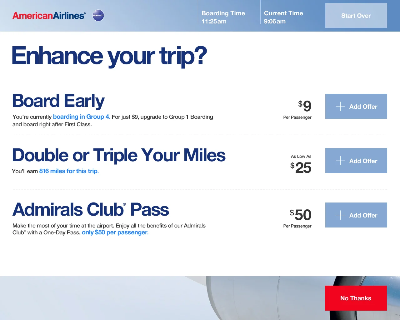 In addition to streamlining the flow and number of steps, we were also faced with the challenge of driving additional sales through merchandising (seat upgrades, early boarding, etc). We explored a various number of flows and engaged in user testing to define the right placement and cadence of the upsell moments.