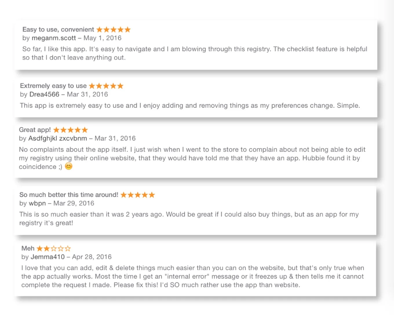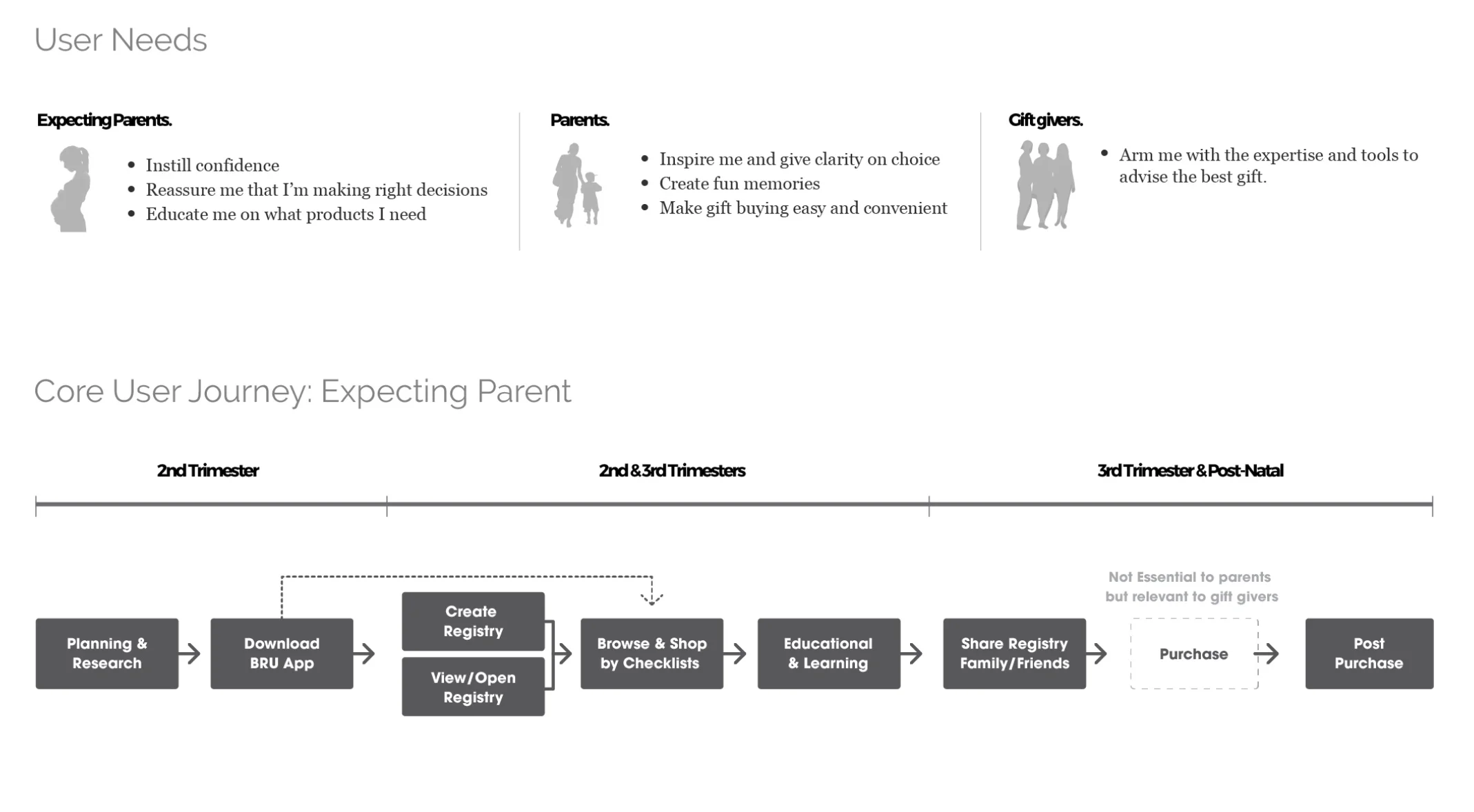 We established the role of the mobile app in relation to the other touchpoints in the ecosystem (store, online, registry services, etc). Through understanding the user's journey and mindset, we clearly defined the mobile app as a guiding advisor to the user. Thus, our KPIs primarily focused on registry conversion, rather than product revenue.